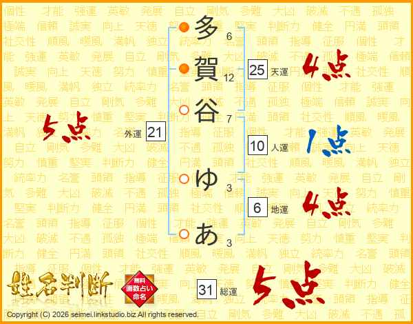 多(6画)賀(12画)谷(7画) ゆ(3画)あ(3画)