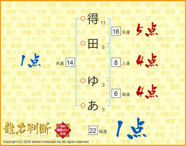 得(11画)田(5画) ゆ(3画)あ(3画)