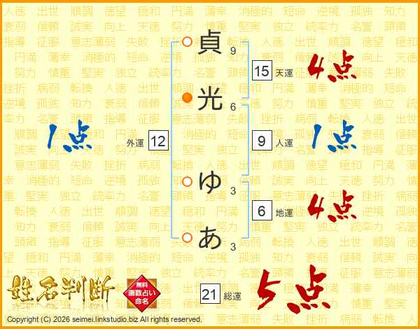 貞(9画)光(6画) ゆ(3画)あ(3画)