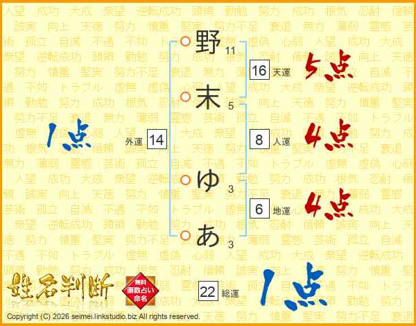 野(11画)末(5画) ゆ(3画)あ(3画)