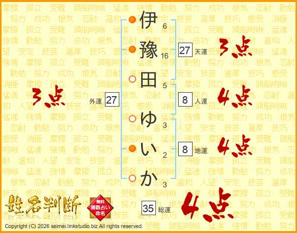 伊豫田ゆいかさんの天運は27画の3点!
