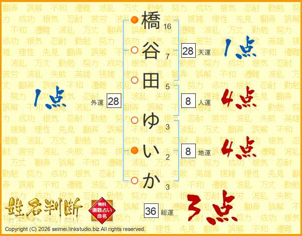 橋(16画)谷(7画)田(5画) ゆ(3画)い(2画)か(3画)