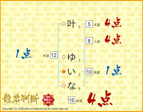 叶(5画) ゆ(3画)い(2画)な(5画)