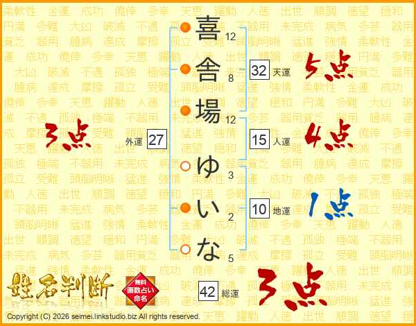 喜(12画)舎(8画)場(12画) ゆ(3画)い(2画)な(5画)