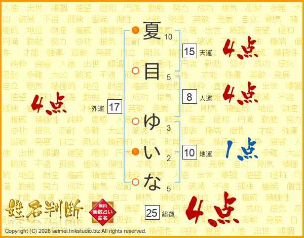 夏(10画)目(5画) ゆ(3画)い(2画)な(5画)
