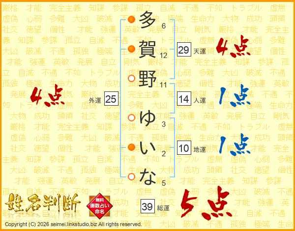 多賀野ゆいなさんの総運は39画の5点!