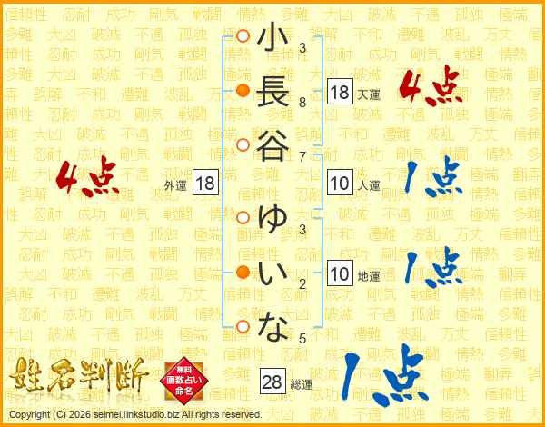 小(3画)長(8画)谷(7画) ゆ(3画)い(2画)な(5画)