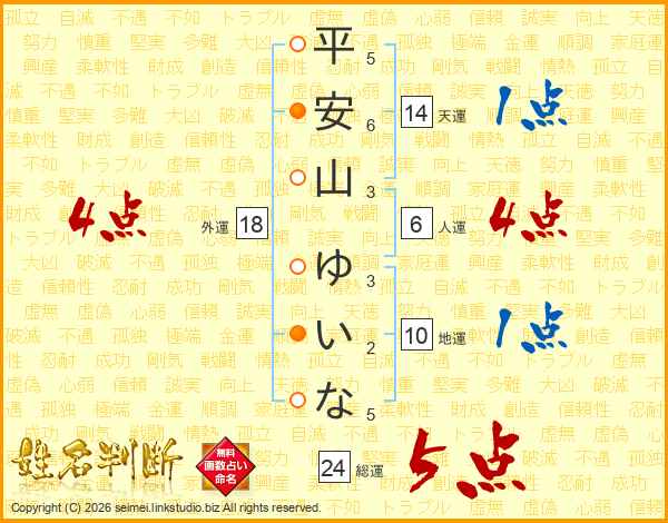 平(5画)安(6画)山(3画) ゆ(3画)い(2画)な(5画)