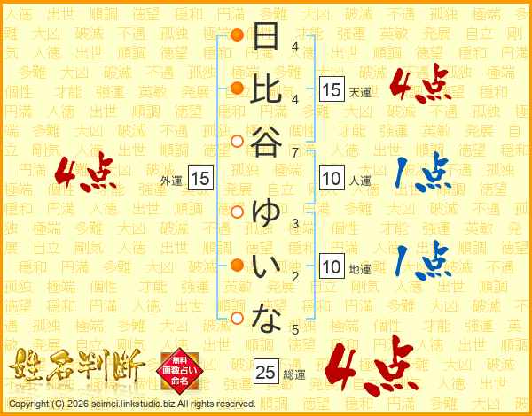 日(4画)比(4画)谷(7画) ゆ(3画)い(2画)な(5画)
