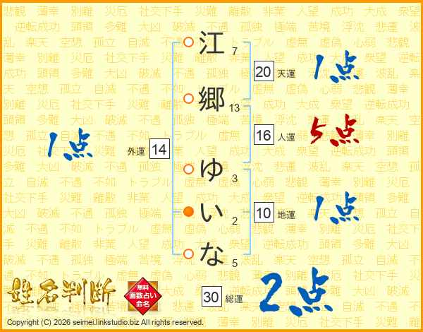 江(7画)郷(13画) ゆ(3画)い(2画)な(5画)