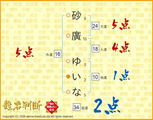 砂(9画)廣(15画) ゆ(3画)い(2画)な(5画)