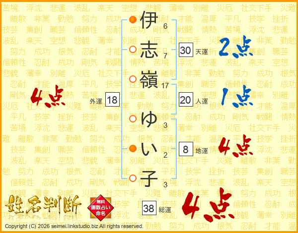 伊(6画)志(7画)嶺(17画) ゆ(3画)い(2画)子(3画)