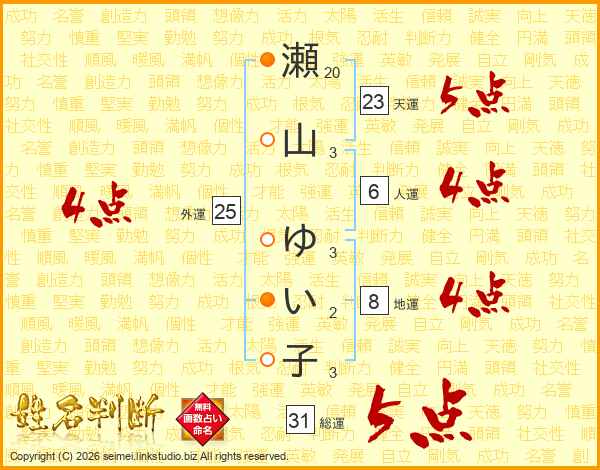 瀬山ゆい子さんの総運は31画の5点!