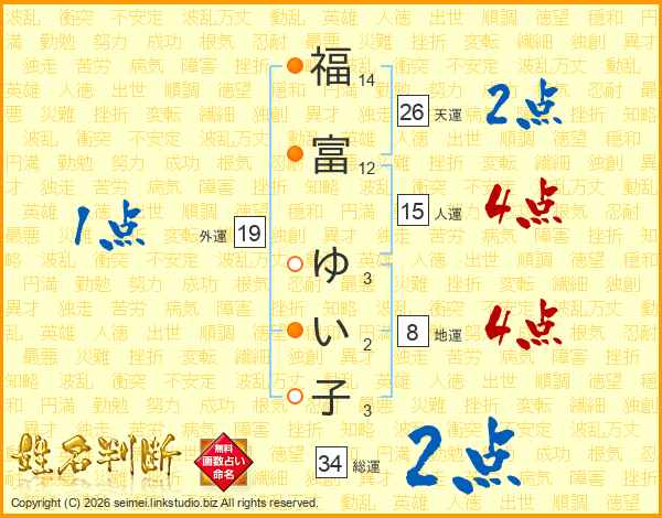 福(14画)富(12画) ゆ(3画)い(2画)子(3画)