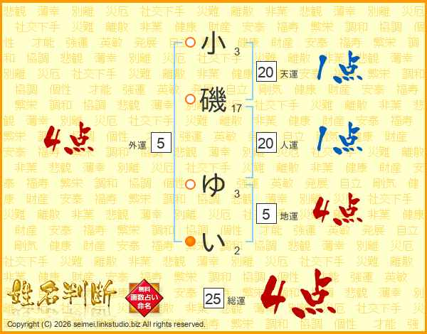 生活面を象徴する運勢です。外部から受ける影響力を表し、結婚運、家庭運や職場、環境への順応性を表します。総運から人運を引いた画数。姓や名が1文字の場合を除く。