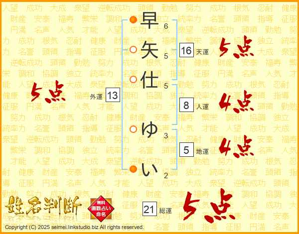 早矢仕ゆいさんの総運は21画の5点!