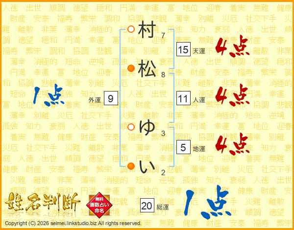 村(7画)松(8画) ゆ(3画)い(2画)