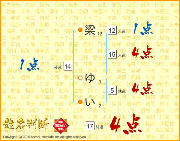 生活面を象徴する運勢です。外部から受ける影響力を表し、結婚運、家庭運や職場、環境への順応性を表します。総運から人運を引いた画数。姓や名が1文字の場合を除く。