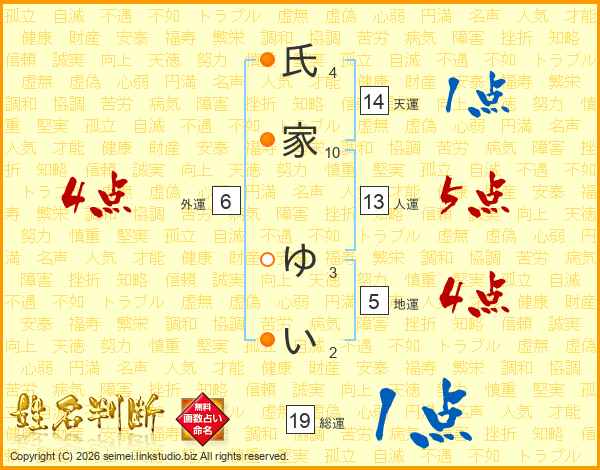 氏(4画)家(10画) ゆ(3画)い(2画)