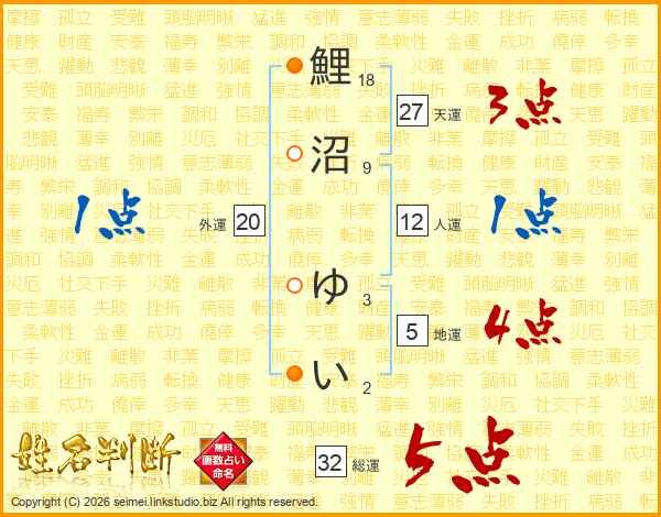 鯉沼ゆいさんの総運は32画の5点!