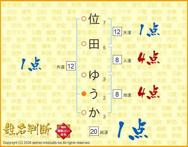 位(7画)田(5画) ゆ(3画)う(2画)か(3画)