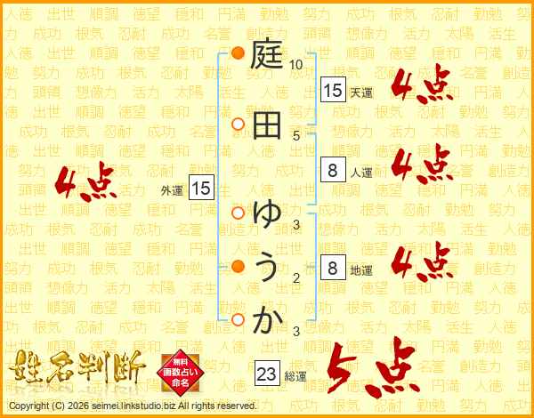 庭(10画)田(5画) ゆ(3画)う(2画)か(3画)