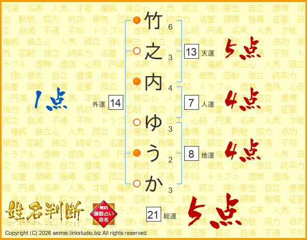 竹之内ゆうかさんの総運は21画の5点!