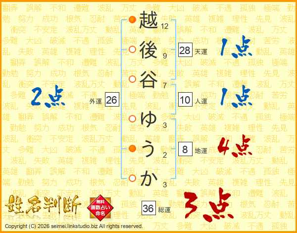 越後谷ゆうかさんの総運は36画の3点!
