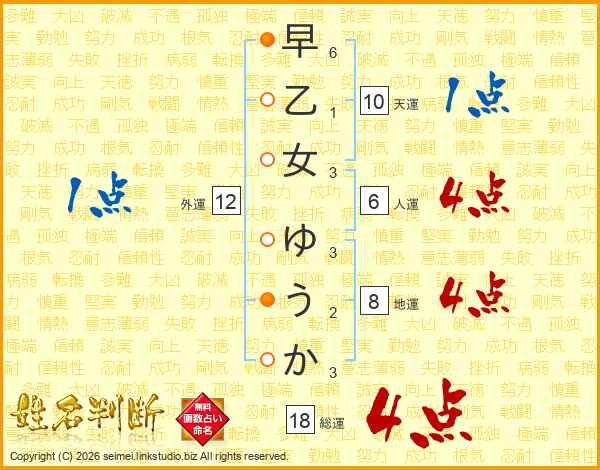 早(6画)乙(1画)女(3画) ゆ(3画)う(2画)か(3画)