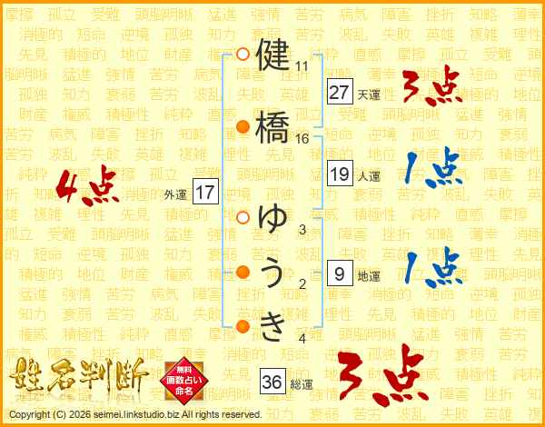 健(11画)橋(16画) ゆ(3画)う(2画)き(4画)