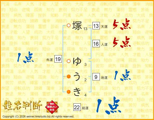 塚ゆうきさんの天運は13画の5点!