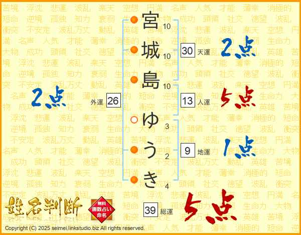 宮(10画)城(10画)島(10画) ゆ(3画)う(2画)き(4画)