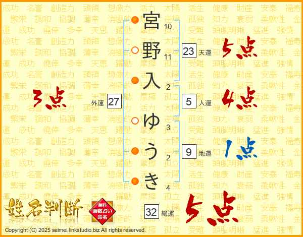 宮(10画)野(11画)入(2画) ゆ(3画)う(2画)き(4画)