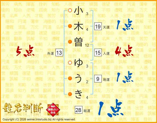 小(3画)木(4画)曽(12画) ゆ(3画)う(2画)き(4画)