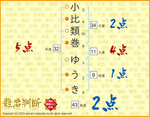 小(3画)比(4画)類(19画)巻(8画) ゆ(3画)う(2画)き(4画)