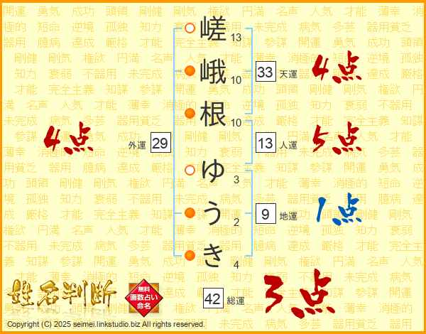 嵯(13画)峨(10画)根(10画) ゆ(3画)う(2画)き(4画)