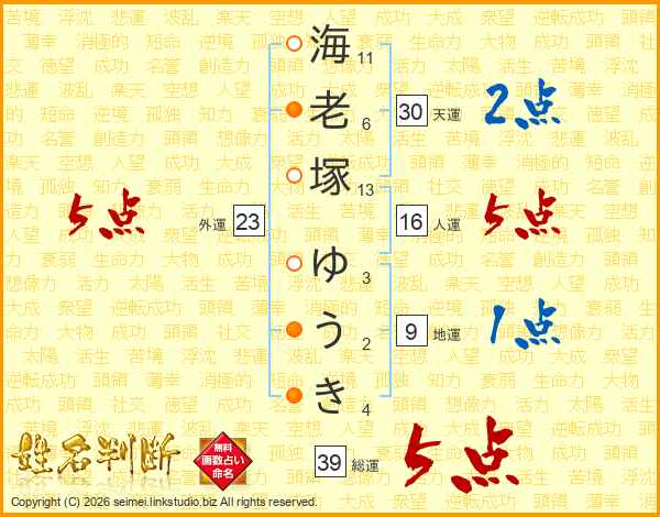 海(11画)老(6画)塚(13画) ゆ(3画)う(2画)き(4画)