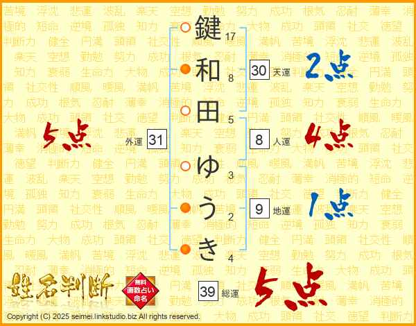 鍵和田ゆうきさんの総運は39画の5点!