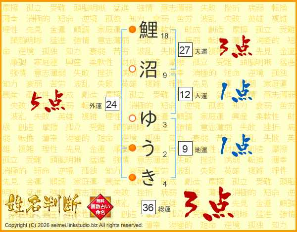 鯉(18画)沼(9画) ゆ(3画)う(2画)き(4画)