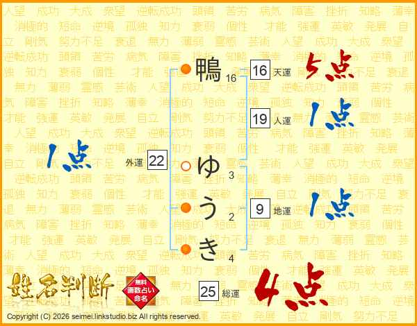 鴨(16画) ゆ(3画)う(2画)き(4画)