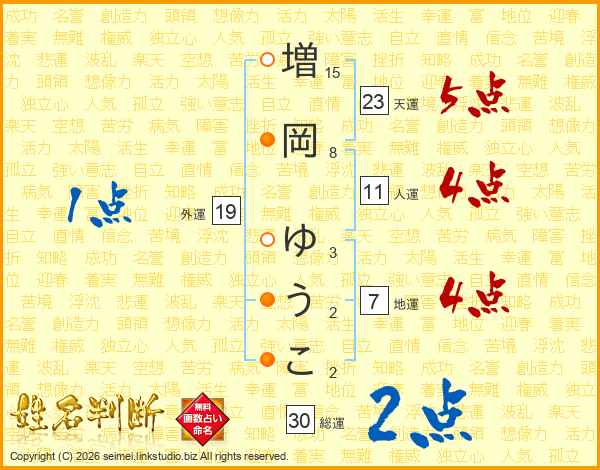 増(15画)岡(8画) ゆ(3画)う(2画)こ(2画)