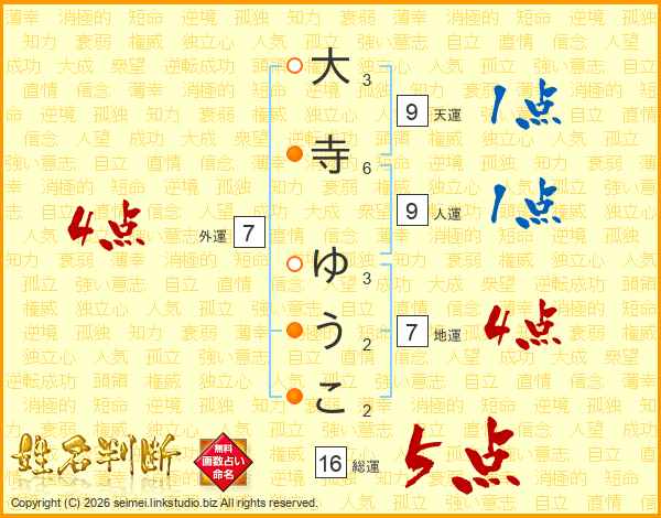 大寺ゆうこさんの総運は16画の5点!