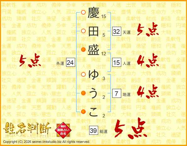 慶田盛ゆうこさんの総運は39画の5点!