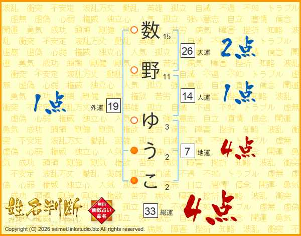 数(15画)野(11画) ゆ(3画)う(2画)こ(2画)