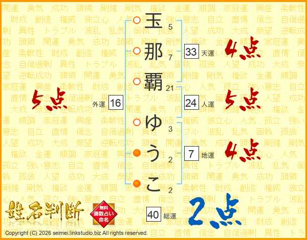 玉(5画)那(7画)覇(21画) ゆ(3画)う(2画)こ(2画)