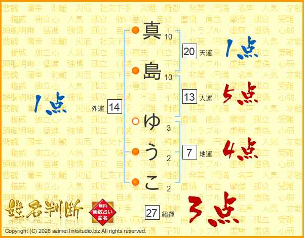 真島ゆうこさんの総運は27画の3点!