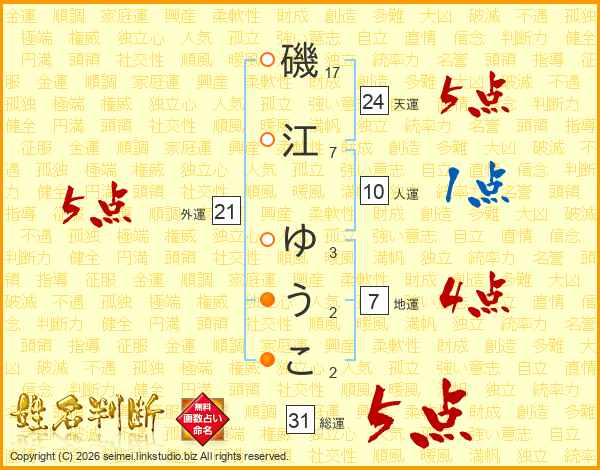 磯(17画)江(7画) ゆ(3画)う(2画)こ(2画)