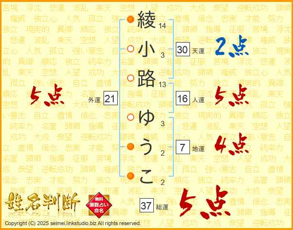 綾(14画)小(3画)路(13画) ゆ(3画)う(2画)こ(2画)