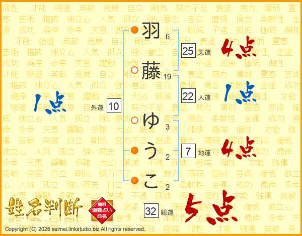 羽(6画)藤(19画) ゆ(3画)う(2画)こ(2画)