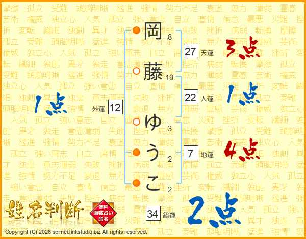岡藤ゆうこさんの総運は34画の2点!